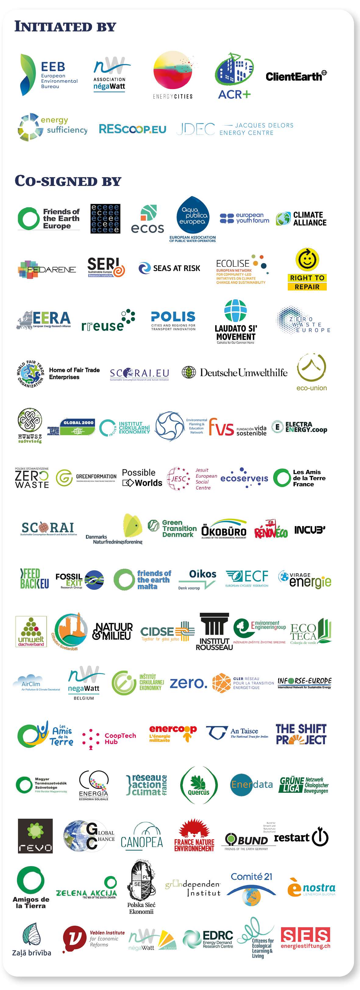 Air pollution & Climate Secretariat – Amigos de la tierra – An Tascie - The national trust for Ireland – Aqua Publica Europea – négaWatt Association – Association of Cities and Regions for sustainable Resource management – BUND - Friends of the Earth Germany – CANOPEA – CELL - the transition hub – CIDSE – Cittadini Sostenibili – CLER - Réseau pour la transition energetique – ClientEarth – Climate Alliance – CO-energia – Comité 21 – CoopTech Hub – Danmark Naturfredningsforening – DUH Deutsche Umwelthilfe – Ecoserveis – Ecoteca – eco-union – EERA European Energy Research Alliance – Electra energy.coop – Enercoop – Enerdata – Energy Demand Research Centre – Energy Sufficiency Research Group (EnSu) – Energy Cities – ènostra coop – Environment Engineering group (EEG) – ECOS - Environmental Coalition on Standards – Environmental Planning & Education Network (EPEN), Hungary – European Council for an Energy Efficient Economy – European Cyclists’ Federation – European Environmental Bureau – European Federation of Agencies and Regions for Energy and Environment (FEDARENE) – ECOLISE - European Network for Community-Led Sustainability Initiatives – European Youth Forum – Feedback EU – FossilExit Research Group – France Nature Environnement – Friends of the Earth Croatia – Friends of the Earth Europe – Friends of the Earth Malta – Fundacion Vida sostenible – Generation Climate Europe – Global 2000 (Friends of the Earth Austria) – Global Chance – Greendependent Institute – Green transition Denmark – Greenformation – Grüne Liga e.V. – Home of fair trade enterprises – Humusz waste prevention alliance – INCIEN – INCIEN.org – Incub’ – Institut Rousseau – Institut Veblen – International Network for Sustainable Energy - Europe – Jacques Delors Energy Institute – JESC – Laudato Si’ Movement – Les amis de la terre Belgique – Les amis de la terre France – Magyar Természetvédők Szövetsége – Natuur&Milieu – negaWatt Belgium – negaWatt Schweiz – Oikos – ÖKOBÜRO - Alliance of the Environmental Movement – Ökumenisches Netzwerk für Klimagerechtigkeit – Polis, Cities and regions for transport innovation – Polska Sieć Ekonomii – Polskie Stowarzyszenie Zero Waste – Polish Economic Network – Possible worlds – Quercus - Associação Nacional de Conservação da Natureza – Renoveco – Rescoop.EU – Réseau Action Climat – Restart – REVO - Prosperidad Sostenible – Right to repair – RREUSE – Seas At Risk – Sustainable Consumption Research and Action Initiative (SCORAI) – Sustainable Consumption Research and Action Initiative Europe (SCORAI.EU) – Sustainable Europe Research Institute – The Shift Project – Schweizerische Energie-Stiftung SES – Umweltdachverband – Virage Energie – Zala Briviba, Green Liberty – Zero – Zero Waste Europe