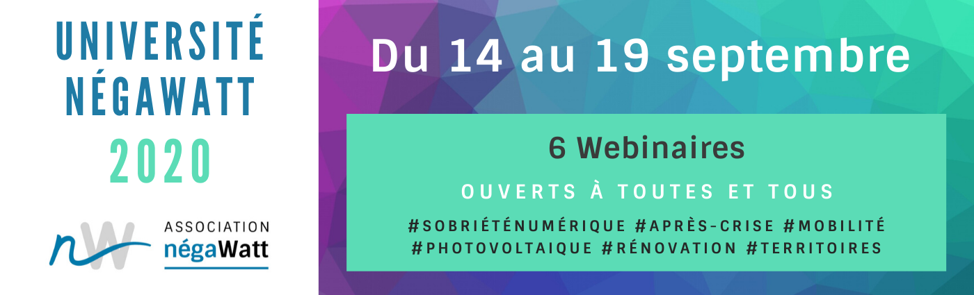 En 2020, en raison des conditions sanitaires inhabituelles, l’Association négaWatt a adapté son Université d’Automne en proposant un format 100 % en ligne. Temps fort annuel pour les adhérents et donateurs de l’association, l’événement était exceptionnellement ouvert à toutes et tous. Au total, un peu plus de 1500 participants ont assistés aux webinaires proposés.